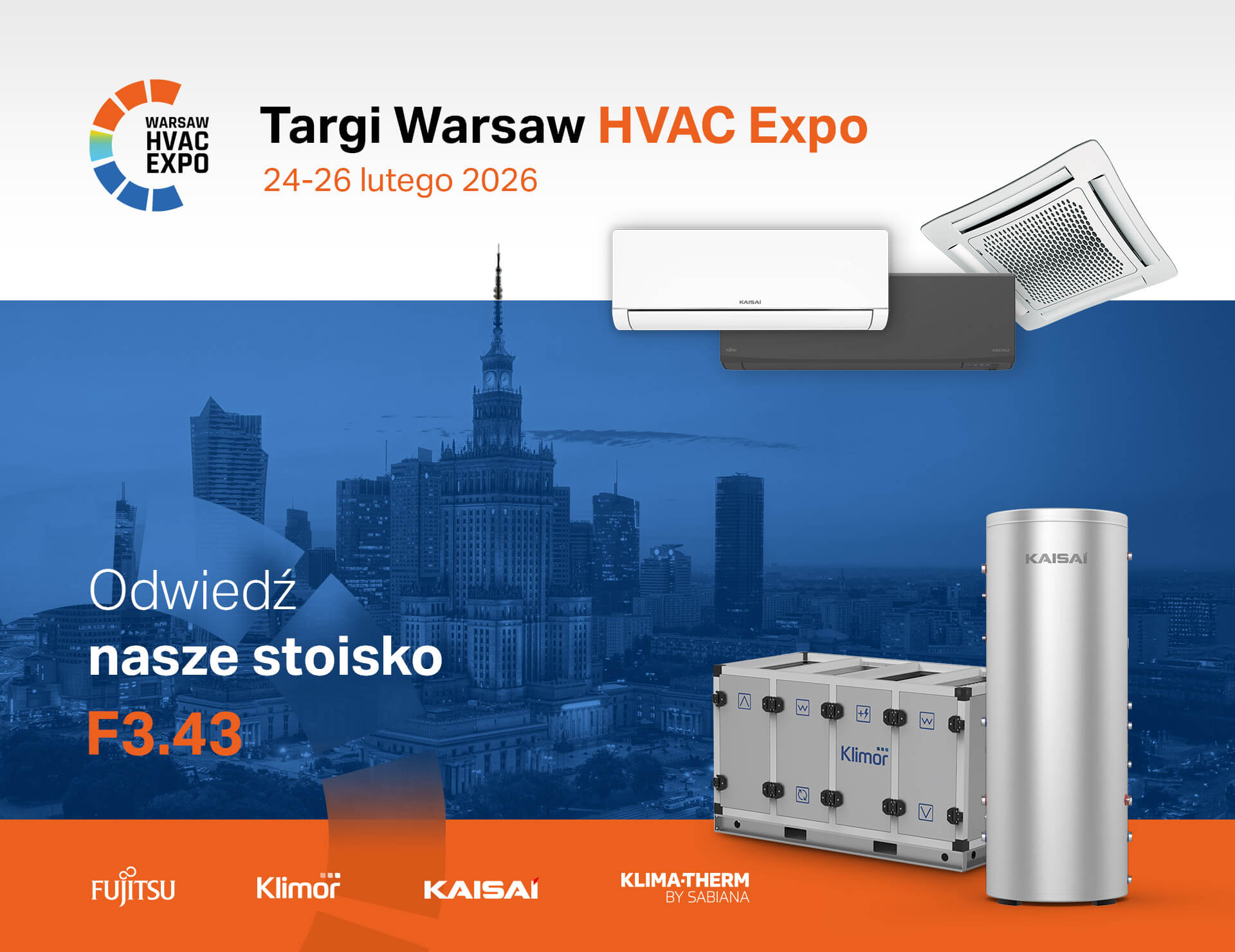 W dniach 24–26 lutego 2026 zapraszamy na WARSAW HVAC Expo 2026, gdzie na wspólnym stoisku Grupy Klima-Therm (F3.43) odwiedzający będą mogli poznać ofertę m.in. marek Fujitsu, KAISAI, Klimor oraz Sabiana.